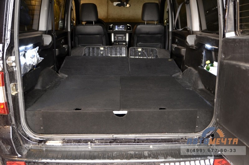 Органайзер в багажник – в некотором роде уникальный тюнинг салона УАЗ Патриот, т.к. конструкция не только позволяет организовать перевозимые вещи в багажнике, но и получить от багажного пространства новую «полноформатную» функциональность. Органайзер позволяет сформировать ровную максимально большую площадку, на которой в комфорте могут ночевать несколько путников.