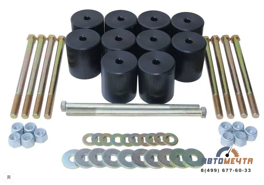 Диаметр отверстия в проставках - 12 мм. Болты диаметром 12 мм. Заводские болты диаметром 10 мм. При установке бодилифта возможно придется рассверлить отверстия в раме и кузове.