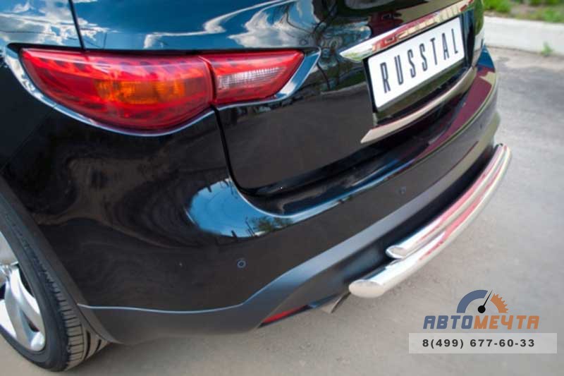 Защита заднего бампера для Infinity FX37 d63/42 мм (Дуга) Защита заднего бампера на Infinity FX37 представляет собой двойную трубу в форме дуги из итальянской нержавеющей стали диаметром 63 мм и 42 мм соответственно. Данная защита бампера предохранит кузов Вашего автомобиля от повреждений и придаст внедорожнику индивидуальности и брутальности.