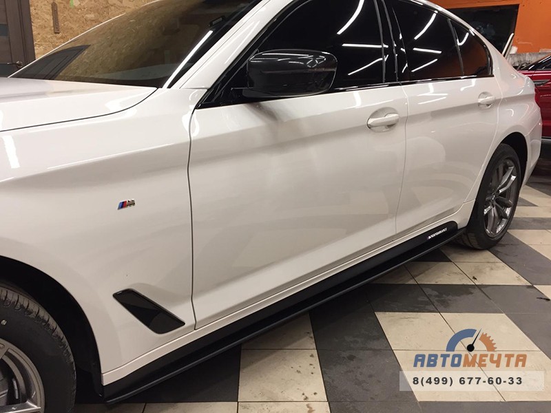 Предлагаем купить накладки под пороги – аналог аксессуаров из серии М-Perfomance от BMW. Выполнены из качественного АБС-пластика с черным лакированием и подходят для установки на пороги автомобилей 5 серии G30-G31. Они дополняют кузов автомобиля, придают ему стильность и функциональность. Клиренс не уменьшается, но визуально автомобиль становится ниже, приобретая черты спорткара. С накладками-лезвиями создаётся эффектная чёрная линия внизу, которая особенно выигрышно смотрится на контрастном цвете кузова. Также помимо эстетических плюсов, накладки также защищают штатные пороги от повреждения.