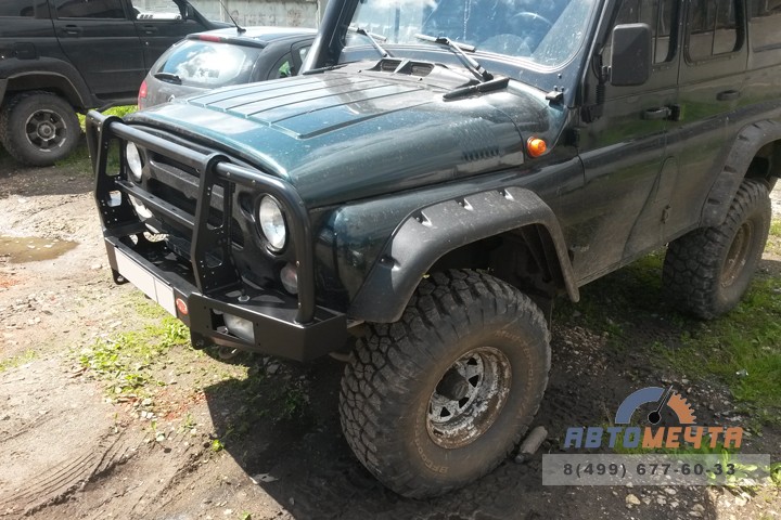 Благодаря своей форме и близкому расположению к кузову бампер обладает отличными геометрическими параметрами. В бампере предусмотрены ниши для установки штатных противотуманных фар, буксирные проушины, вырезы для клюва реечного домкрата.