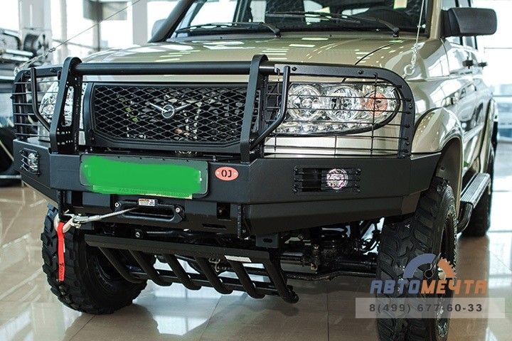 Передний силовой бампер изготовлен на УАЗ «Патриот» или УАЗ «Пикап» в максимальной комплектации с площадкой лебёдки. Для установки лебёдки дополнительно ничего приобретать не требуется. Размеры площадки позволяют установить большинство современных лебёдок без каких-либо проставок или переделок. Площадка под клюз лебёдки обеспечивает строго горизонтальную смотку троса с барабана лебёдки, что важно для максимального использования мощности лебёдки. Удобный доступ к лебёдке благодаря большому проёму над площадкой.