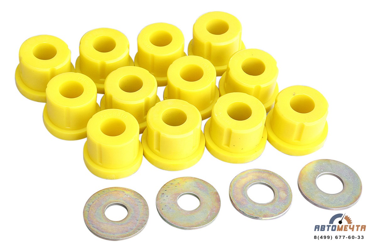 В штатные рессоры данные втулки могут быть установлены, если они изначально предназначены под установку резиновых втулок диаметром 42 мм, а не сайлентблоков (резинометаллический шарнир диаметром 45мм). Диаметр втулок 42 мм. В комплекте 12 втулок и 4 упорных шайбы. Упорные шайбы устанавливаются на болт крепления рессоры к раме.