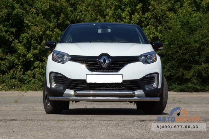 Защита переднего бампера двойная (НПС 63/63 мм) Рено Каптюр с 2016 – один из самых популярных декоративно-защитных аксессуаров. Изготовлен из итальянской нержавеющей стали с зеркальной полировкой поверхности в виде двух мощных труб, изогнутых по дуге и соединенных между собой сваркой.