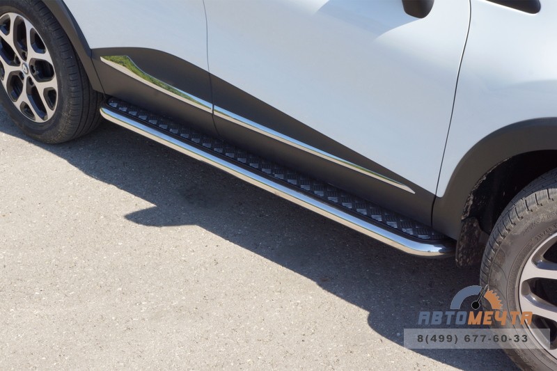 Защита порогов с алюминиевой площадкой (НПС) Рено Каптюр с 2016 – особый в своем роде декоративно-защитный аксессуар из нержавеющей стали, который выполняет одновременно несколько функций: